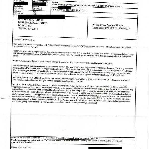 En Barrera Legal Group, nos complace anunciar la exitosa renovación de Acción Diferida para los Llegados en la Infancia (DACA) para un cliente al que hemos representado desde 2019. Durante estos años, lo hemos acompañado en múltiples renovaciones, asegurando su protección contra la deportación y su autorización de trabajo en Estados Unidos.